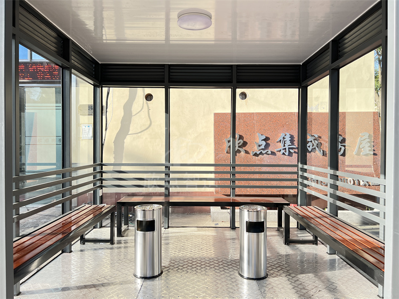 吸煙亭內(nèi)部配置:LED燈、休息椅、滅煙桶、開關(guān)、插座、配電箱