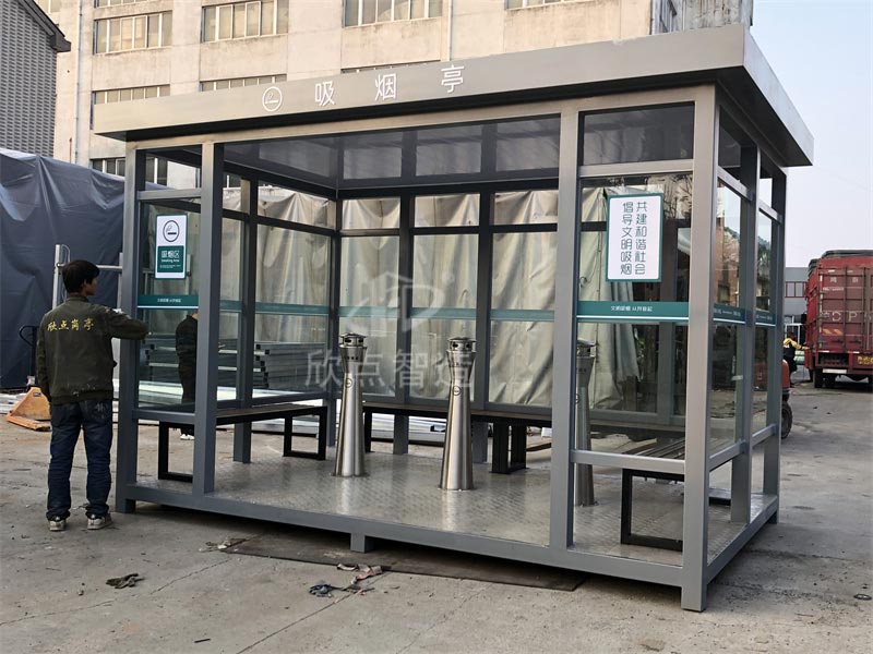 鋼化玻璃吸煙亭:光線明亮,安裝方便,工廠組裝好成品整體運輸?shù)跹b到位,堅固耐用,使用壽命至少十年,重型鋼結(jié)構(gòu),抗臺風(fēng)。頂部使用鋁板防水隔熱材料,保證下雨不漏水,隔音效果優(yōu)良。并且內(nèi)置電路,只要通電就可以在亭內(nèi)使用電力設(shè)施,室內(nèi)配置休息椅和煙灰桶,方便的功能,時尚的外觀,實在是廣大禁煙場所的不二之選!