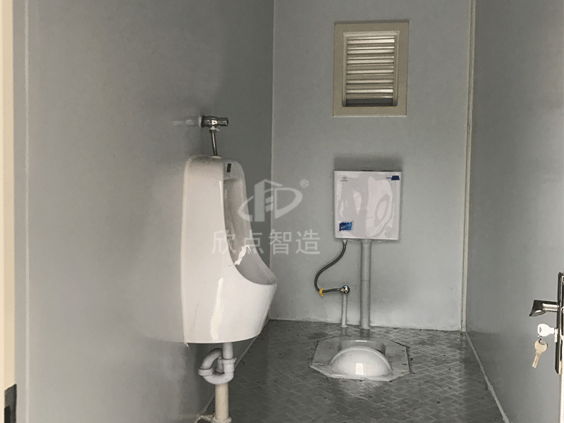 移動廁所內(nèi)部配置:小便池、蹲坑、304不銹鋼鎖、LED燈、開關(guān)、排風(fēng)扇、配電箱